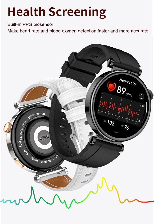 İşlevleri: TERMOMETRE, Takvim, Çalar Saat, Güç Rezervi, Uzaktan Kumanda, Geri Sayım, Uyku Takibi, Fitness Takip Cihazı, Pasometre, Çağrı Hatırlatıcı, Çağrıyı Cevaplama, Anında Mesaj, Mesaj Hatırlatıcı, Arama Çevirme, Kalp Atış Hızı Takip Cihazı, Kan oksijen monitörü, Kalp Atış Hızı Monitörü, Pedometre, Adet Yönetimi, Gebelik takibi