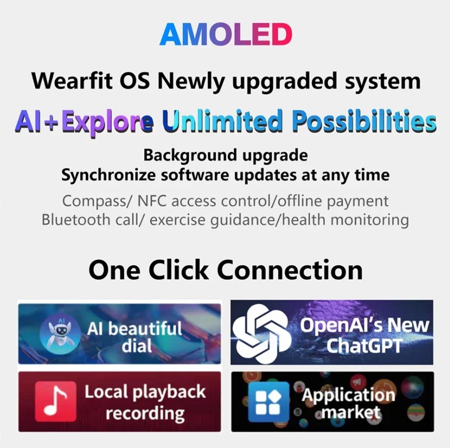 Yerel Albüm, E-kitap, AI saat yüzü, ChatGPT, 2GB ROM, Yerel müzik, Ses kaydı, Takvim, Her zaman açık ekran modu, Gerçek Pusula, Kalp atış hızı, Kan basıncı, Kan oksijen, Spor, Uyku izleme, Basınç, Etkinlik kaydı, Bluetooth aramaları, Mesaj bildirimi, Sesli asistan, Müzik kontrolü, Hava Durumu, Çalar saat, Kronometre, Nefes eğitimi, Zamanlayıcı, Telefon bul, Alipay, solunum hızı, kısa video kontrolü, Kamera kontrolü, Bildirim ayarı, Saat modu yanında, Bilekten aktif uyandırma -yukarı, Rahatsız etmeyin modu, ekran kapanma süresi, NFC kapı erişimi, ekran kapanma saat yüzü, Parlaklık ayarı…