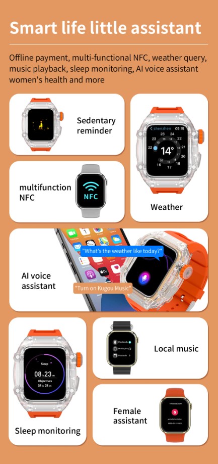 Kronograf, PUSULA, Takvim, Çalar Saat, Güç Rezervi, Uzaktan Kumanda, Geri Sayım, Uyku Takipçisi, Hız Ölçümü, Fitness Takipçisi, Pasometre, Çağrı Hatırlatıcı, Çağrıyı Cevaplama, Anlık Mesaj, Ruh Hali Takipçisi, Mesaj Hatırlatıcı, Arama Çevirme, Kalp Atış Hızı Takipçisi, Nem Ölçümü, Hareket kontrolü, Kan oksijen monitörü, GPS Navigasyon, Aktivite Takipçisi, Sosyal Medya Bildirimleri, Ses Kaydı, Kalori Takipçisi, Nabız Monitörü, Adımsayar, Sesli Arama, Nefes Monitörü, Mesafe Takipçisi, Çoklu Spor Takipçisi, Müzik çalar, Hareketsiz Hatırlatma, SOS düğmesi, Adet Yönetimi, Yapay Zeka sesli asistanı