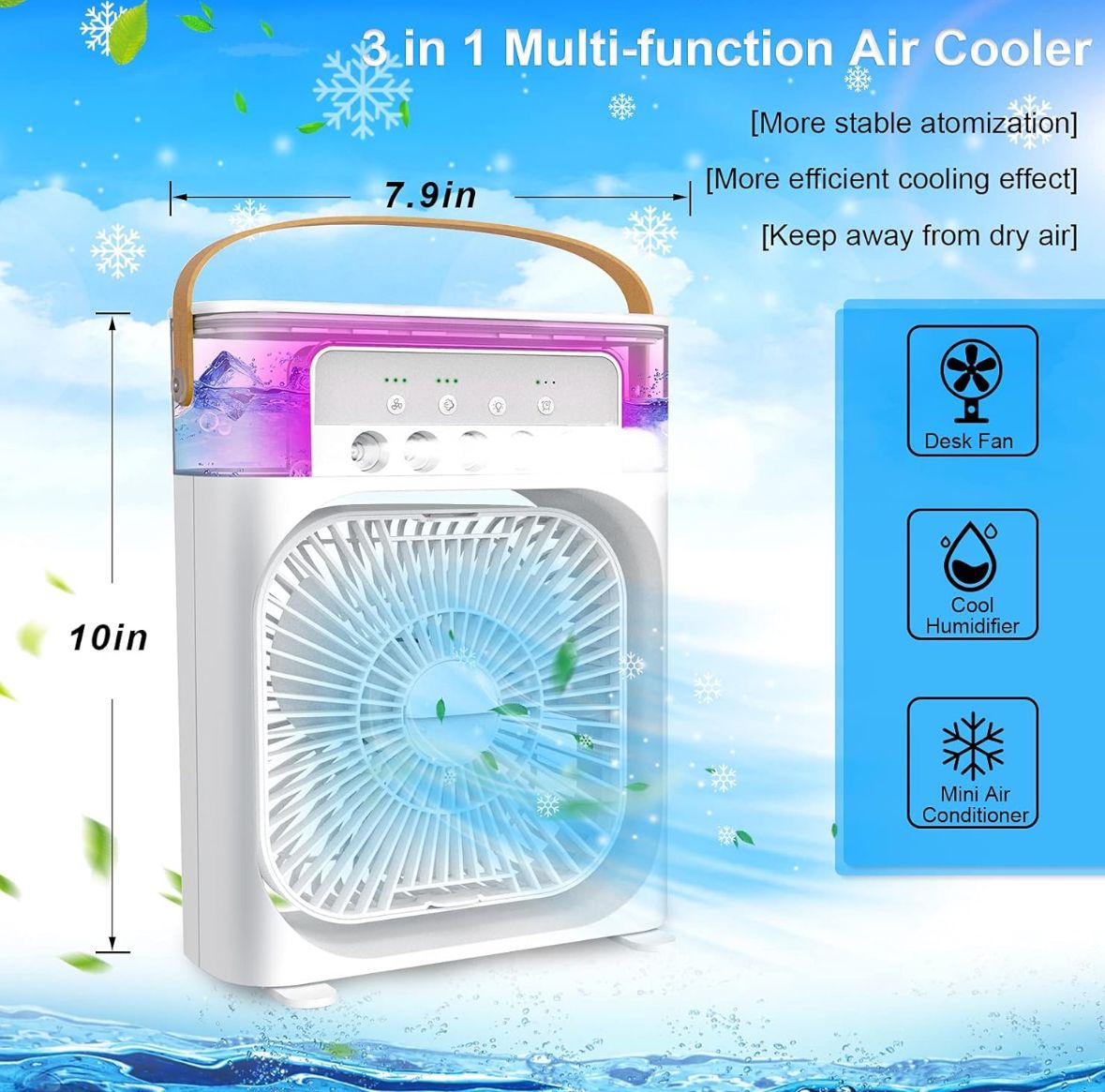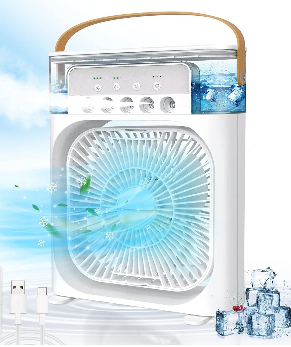 Çok Fonksiyonlu Taşınabilir Hava Soğutucu : 4’ü 1 arada taşınabilir klima, buharlı nemlendirici, masa fanı ve gece ışıkları