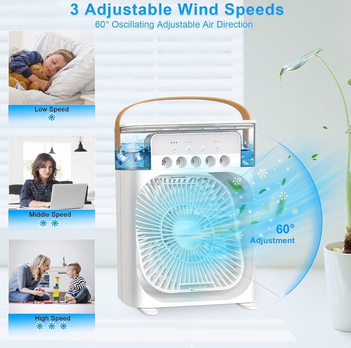USB kablosunu güç kaynağına takın, serin rüzgarın keyfini çıkarın, 3 rüzgar hızını (yüksek, orta, düşük) ve 3 ayarlanabilir spreyi (Düşük/Orta/Yüksek) ayarlayabilirsiniz,