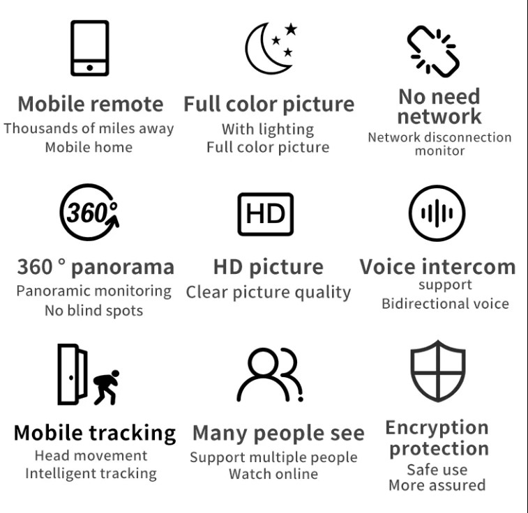 Özellikleri: İnsan Hareketi Takibi, Hareket Algılama, GECE GÖRÜŞÜ, Çift Yönlü Ses, Suya / Hava Koşullarına Dayanıklı, PAN-TILT, Panoramik 360 Derece güvenlik kamerası